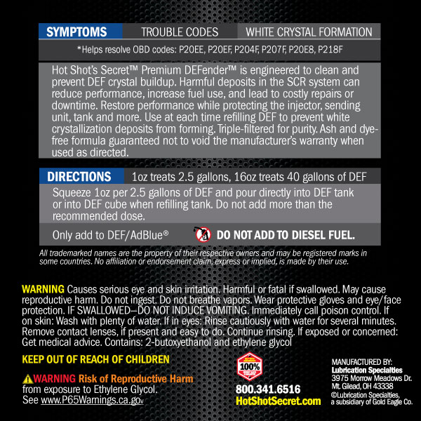 Hot Shot’s Secret™ Premium DEFender™ is engineered to clean and prevent DEF crystal buildup. Harmful deposits in the SCR system can reduce performance, increase fuel use, and lead to costly repairs or downtime. Restore performance while protecting the injector, sending unit, tank and more. Use at each time refilling DEF to prevent white crystallization deposits from forming. Triple-filtered for purity. Ash and dye-free formula. For use in all SCR-equipped diesel engines including cars, trucks, semis and equipment, will not void OEM warranties when used as directed. Fully compatible with all brands of DEF.